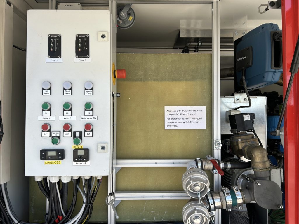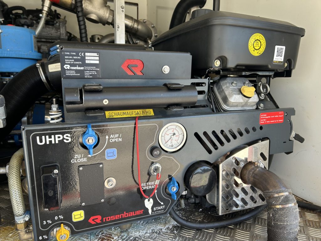 - 1x Rossenbauer UHPS extinguishing system 38/l min with integrated foam proportioning system and retractable 60m reel and lance